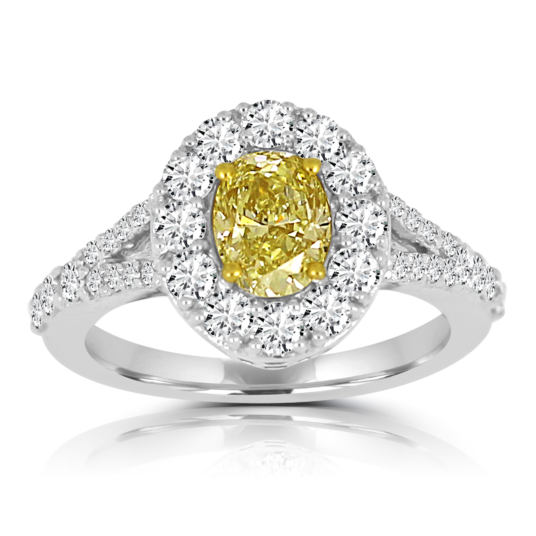 Oval Shape Yellow Diamondd Ring surrounded with White Diamonds set on a Diamond studded split shank in 18k gold