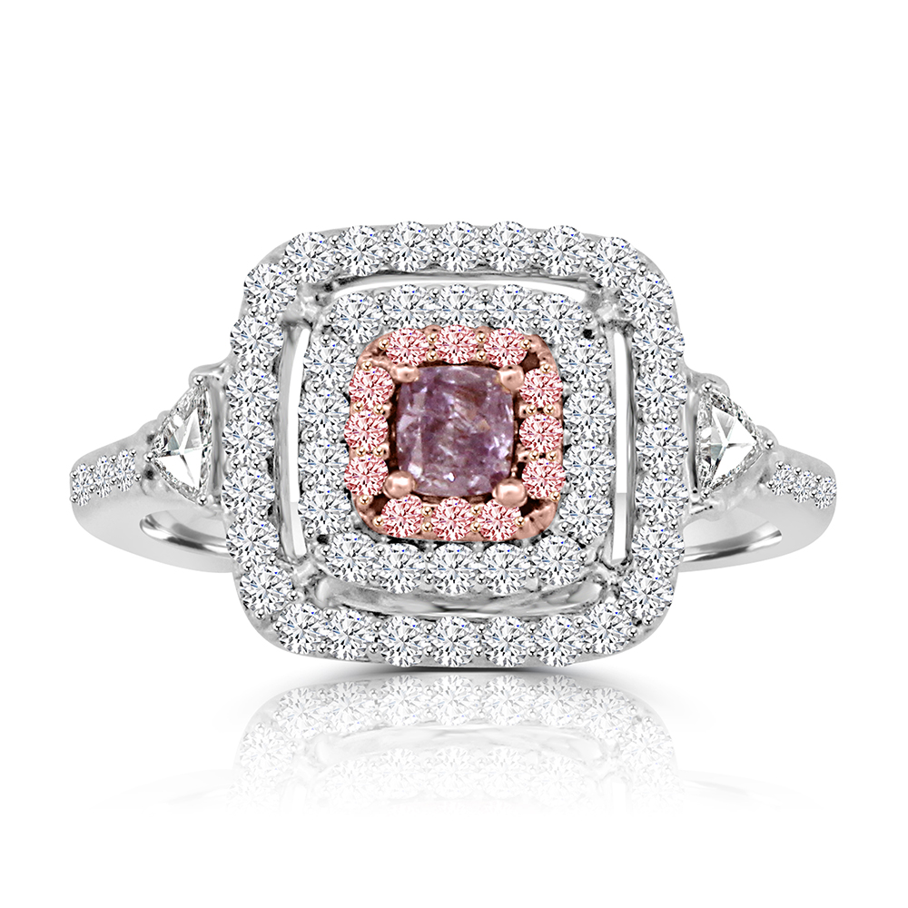 Ring featuring Cushion Cut Natural Pink Diamond surrounded with Natural Pink and White Diamond melees accented with two Trillion Rose Cut Diamonds on sides, set in 18K gold