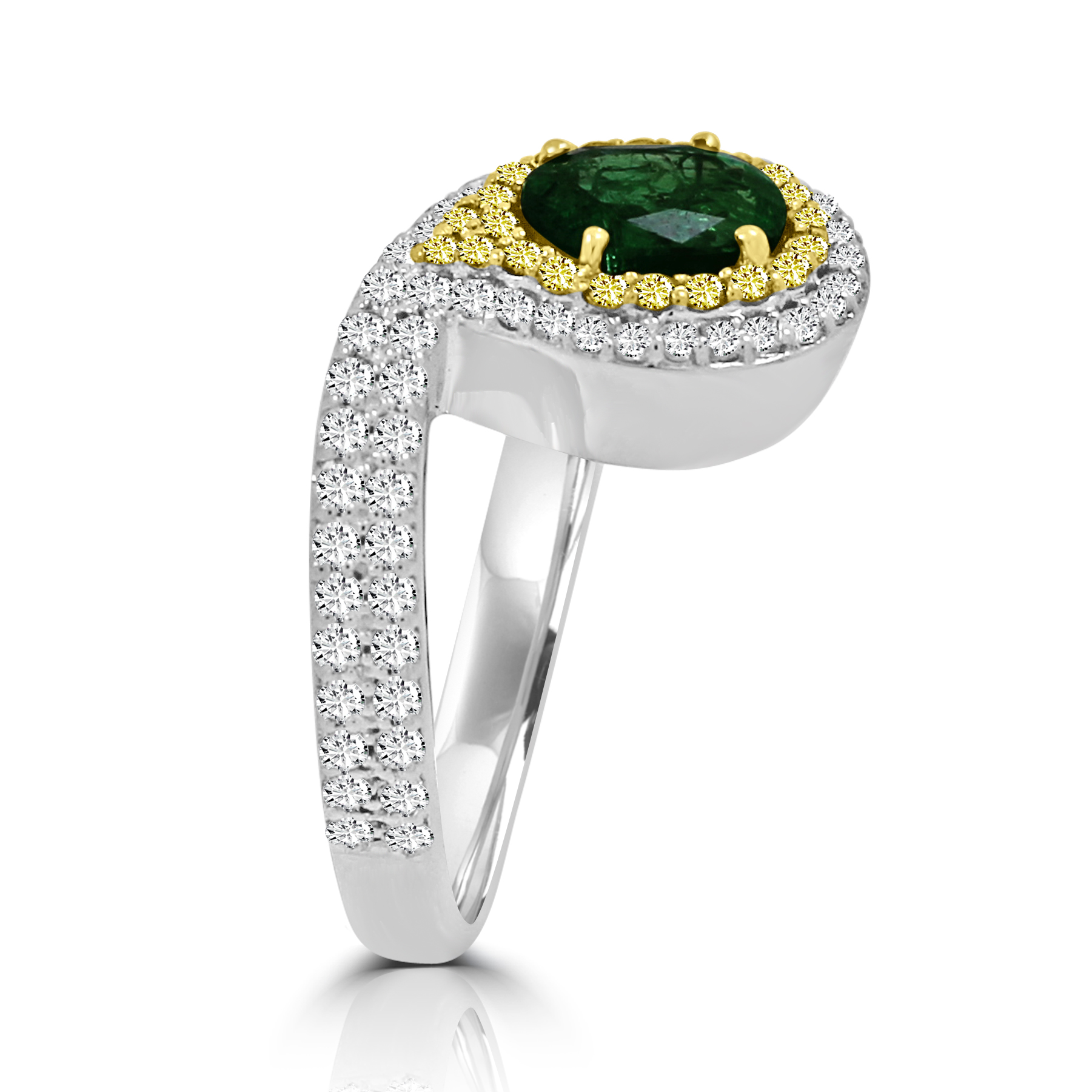 Oval Emerald surrounded with Natural Yellow and White Diamond melees designed as a Paisley Open Ring set in 18k gold